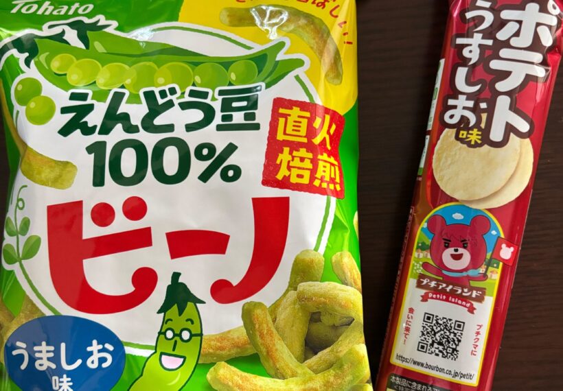 おつまみになりそうなブルボンのプチのポテトうすしお味とトーハトのえんどう豆100%うましお味のビーノを選んで頂きました💖